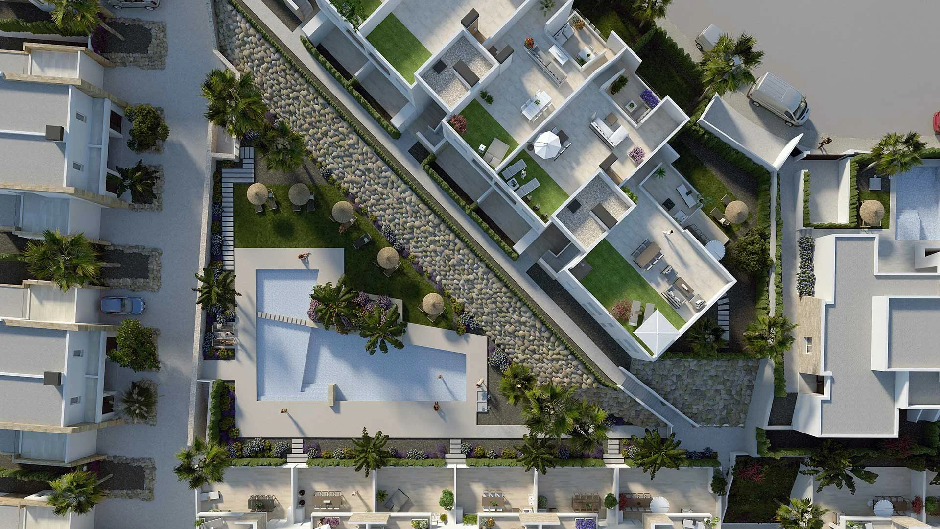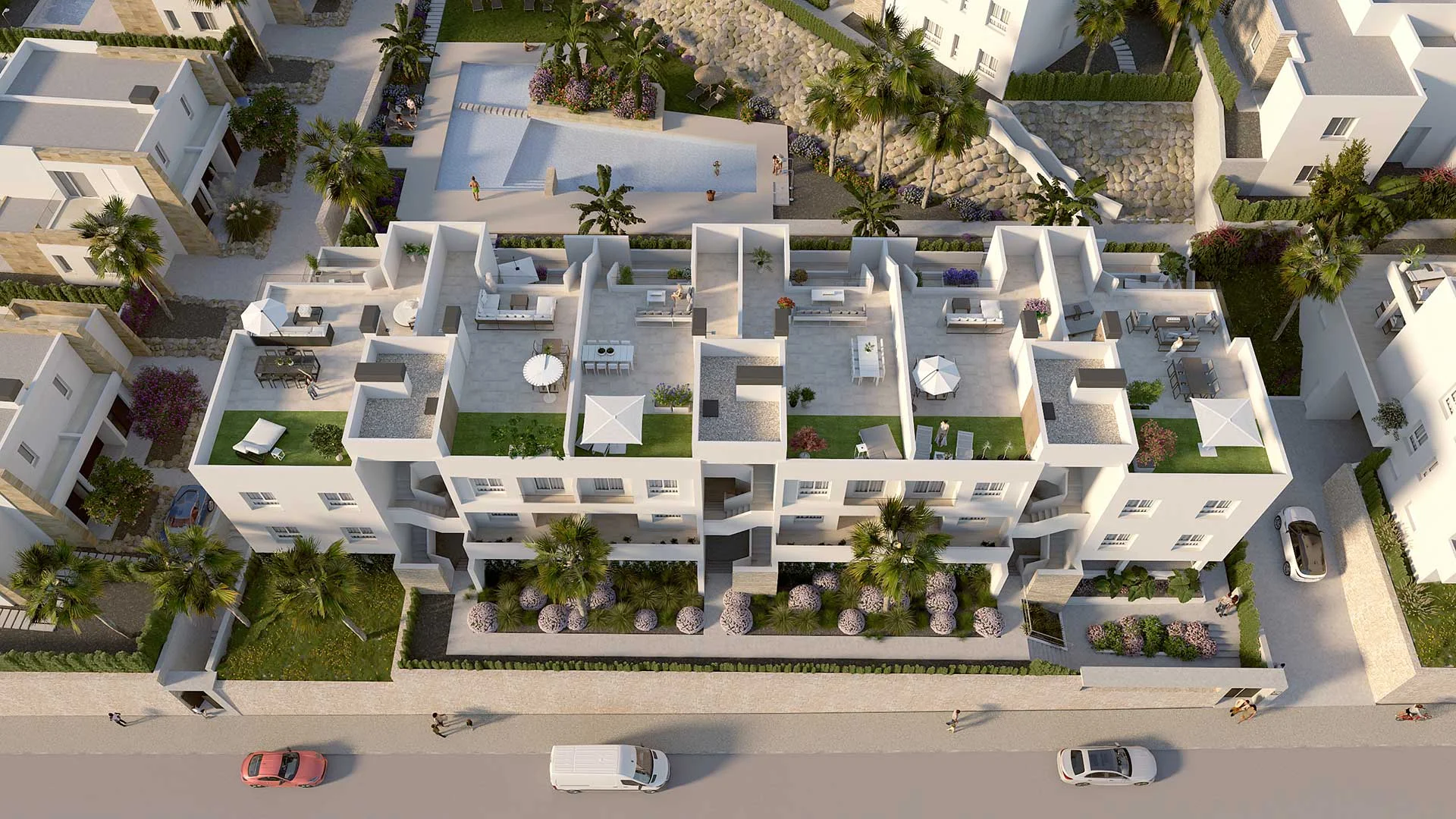Ubicados en La Finca Resort, un lugar exclusivo y privilegiado en Costa Blanca Sur, encontramos los apartamentos Zante en nuestro nuevo Residencial Mar Egeo. Estos luminosos apartamentos de 2 o 3 dormitorios se distribuyen en tres bloques de dos plantas cada uno.